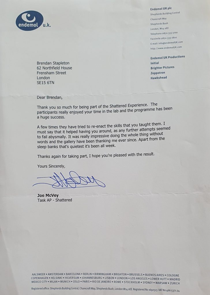 Brendan Stapleton as a Classical French Mime taught a mime workshop for Channel 4 “Big Brother” Series “Shattered”, a competition featuring Sleep Deprivation.